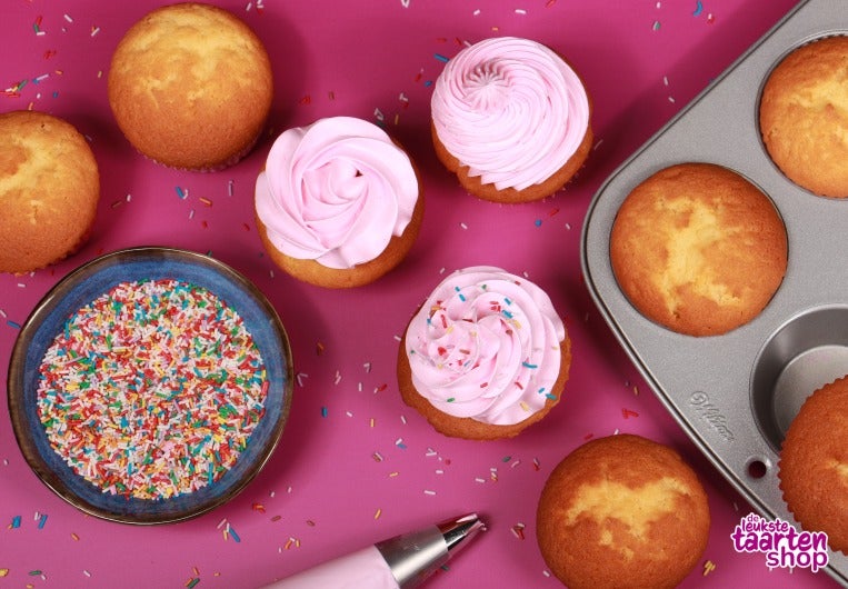 Op een cupcake hoort een toef crème! Je kunt van botercrème of Enchanted Cream mooie toeven en rozetten op de cupcakes spuiten, waarmee je de cupcakes kunt versieren. Met de verschillende spuitmondjes van Wilton, PME en JEM kun je prachtige botercrème decoraties op de cupcakes spuiten. Decoreer de cupcakes met strooisels en je hebt een unieke cupcake. Om een cupcake te versieren kun je ook suikerdecoraties, fondant, marsepein of snoepjes gebruiken.