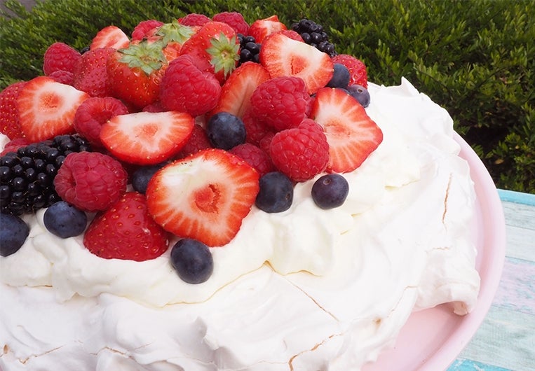 Pavlova is een taart gemaakt van meringue met een knapperige buitenkant en een chewy binnenkant. Deze pavlova schuimtaart kun je vervolgens decoreren met verschillende vers fruit, zoals frambozen, bramen en blauwe bessen, maar geef er vooral lekker je eigen twist aan! Onderstaand pavlova taart met slagroom en vers fruit recept is heerlijk als dessert, maar is ook ideaal tijdens Kerst. Liever een poeder gebruiken om je pavlova te maken? Bij de FunCakes meringue poeder hoef je alleen maar water toe te voegen!
