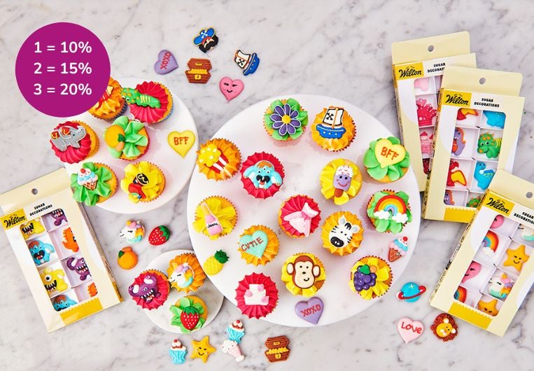 Makkelijk je baksels een kleurrijke en feestelijke finishing touch geven? Met onze suikerdecoraties decoreer je in een handomdraai al je baksels. Tot en met 29 januari profiteer je van een oplopende korting op suikerdecoraties: 10% bij 1 product, 15% bij 2 producten en 20% bij 3 producten of meer.
